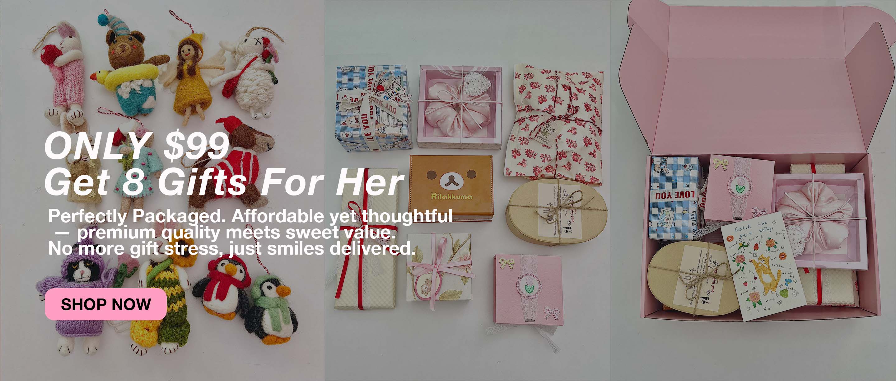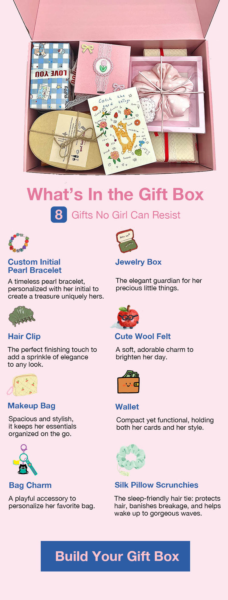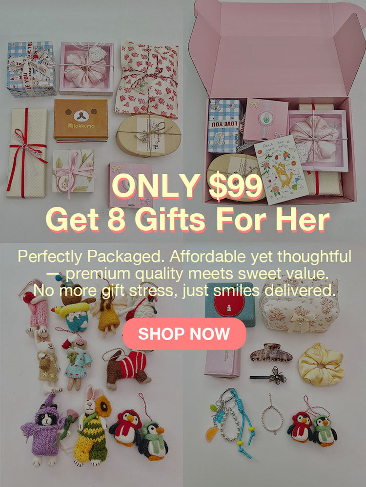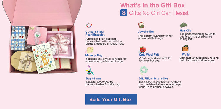 A: The box contains 8 carefully curated gifts for girls—each individually wrapped and presented in our luxurious signature packaging.
